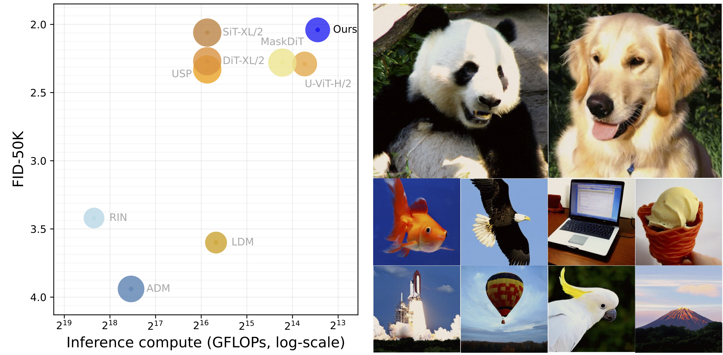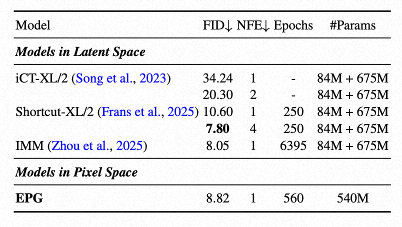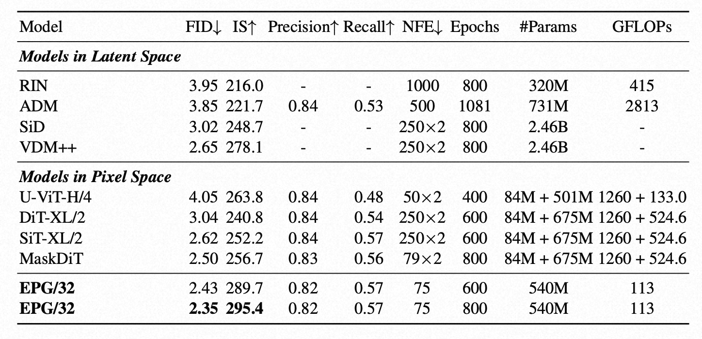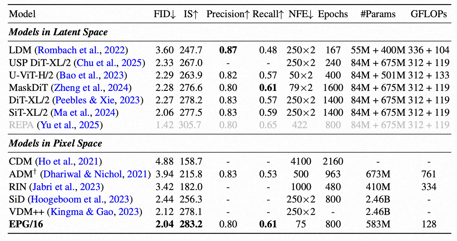 Table 1: System-level comparison on ImageNet-256 with CFG. For latent-space models, we display model parameters and sampling GFLOPs of both the VAE and the generative model. We report GFLOPs of our EPG following DiT. †: both model parameters and GFLOPs are composed of two generative models and one classifier. Text in gray: method that requires external models in addition to VAE.