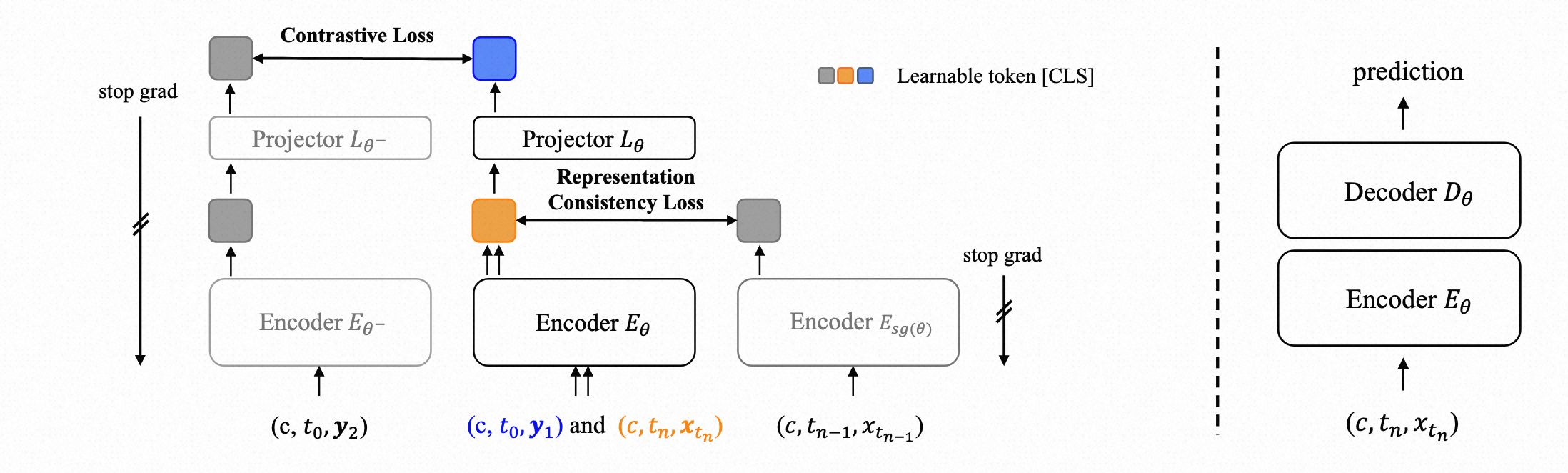Figure 2: Overview of our method. (Left) Our pre-training framework. c is a learnable token [CLS], t0, tn, tn−1 are time conditions, (y1, y2) are augmented views of clean image xt0, (xtn , xtn−1 ) are temporally adjacent points from the same PF ODE trajectory with xt0 as the initial point. θ− is the exponential moving average of θ, and sg is the stop gradient operation. (Right) Fine-tuning stage. After pre-training, we discard the projector and train Eθ along side a randomly initialized decoder Dθ in downstream generation tasks.